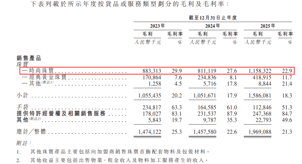 回归高增长的时尚珠宝并未成功拉动公司的整体毛利率。据招股书显示,该项毛利率从2023年的29.9%降至2025的22.9%。