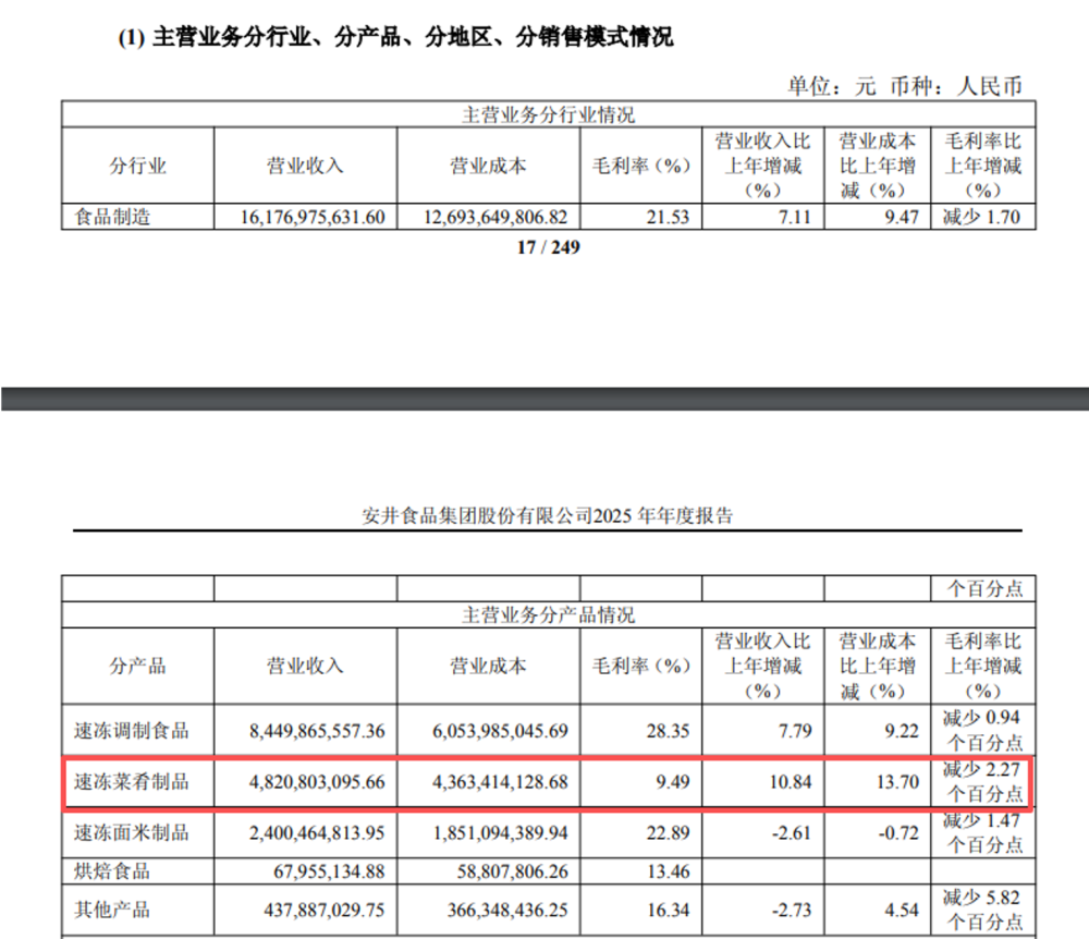 但2025年年报数据显示,截至报告期末,除超 1.6 亿元商誉减值外,安井食品速冻菜肴制品(含小龙虾)毛利率仅 9.49%,较 2024 年下降 2.27 个百分点,为各业务板块中最低。