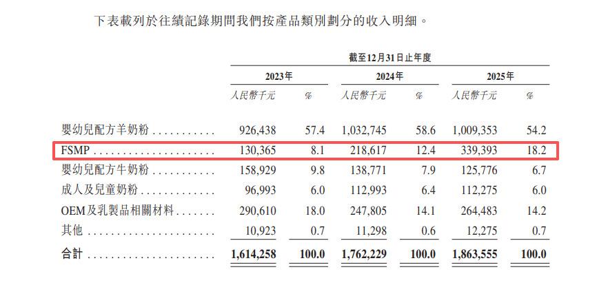截至2025年底,宜品以4.5%的份额杀入国内整体前五。数据显示,宜品FSMP业务收入从2023年的1.30亿元狂飙至2025年的3.39亿元,营收占比从8.1%升至18.2%;2025年该业务毛利率为74.7%。