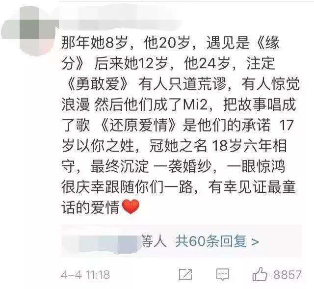 在两人的粉丝眼里,这是一段成功打破世俗禁锢、双方勇敢相爱、多年不离不弃最终开花结果的唯美浪漫爱情故事。