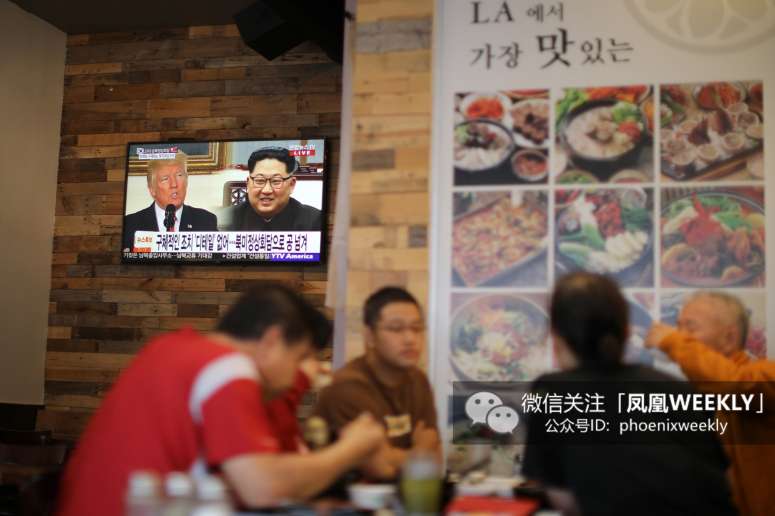 2018年4月27日,美国洛杉矶韩国城,餐厅的电视上播放特朗普计划会见金正恩的消息。