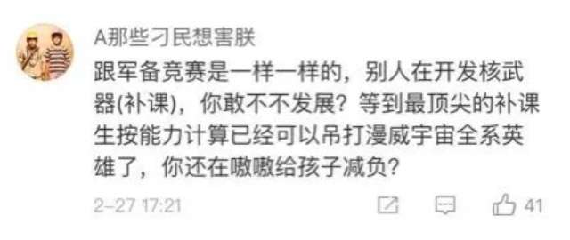 有网友把孩子的教育比喻成军备竞赛,落后就得“挨打”