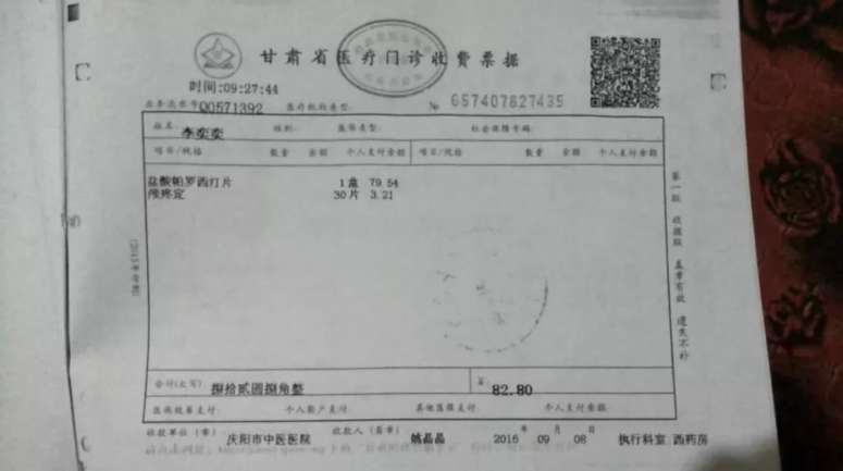 李奕奕父女第一次到庆阳市中医医院就诊后的药单,时间为2016年9月8日。此次就诊并没有诊断结果和“抑郁症”诊断书。(除特别标注外,图片均为作者所摄)