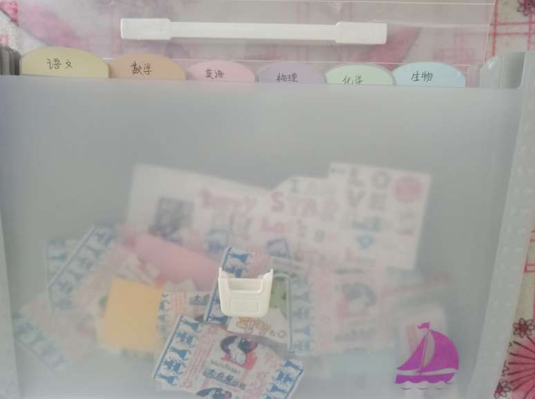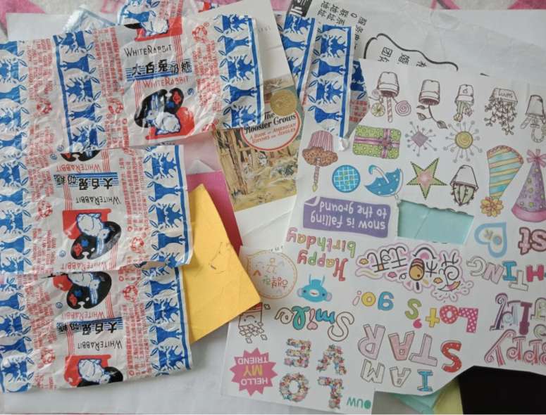 李奕奕收藏在文件袋中的大白兔奶糖糖纸和卡通剪纸