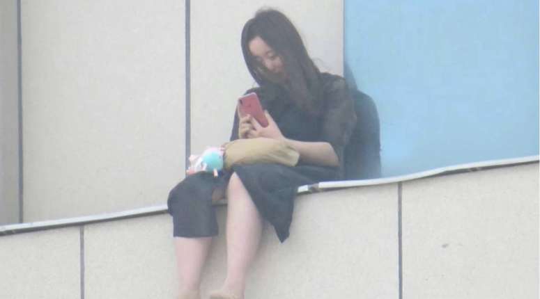 李奕奕是从8楼一家废弃的餐厅翻窗走到边沿的。一开始,她在边沿踢下窗沿上的石子和建筑碎屑,高空的风吹来时,人们能看到她伸手捋头发。许多人拍到她坐在边沿低头看手机的样子,小腿垂在墙外,大腿上放着黄色提包和一个布娃娃。